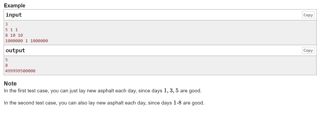 scanf(" %lld %lld %lld", &n, &g, &b);