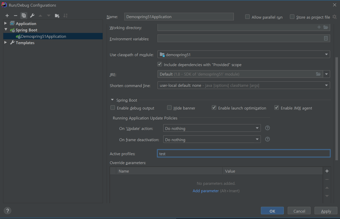 - 그럼 위와같이 Active profiles에 test를 넣어줄 수 있다!