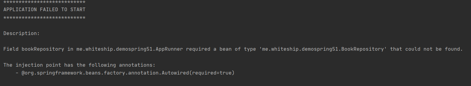 - 그럼 다음과 같이 빌드에 실패한다! 이유는 BookRepository가 test Profile에서만 생성되기 때문이다