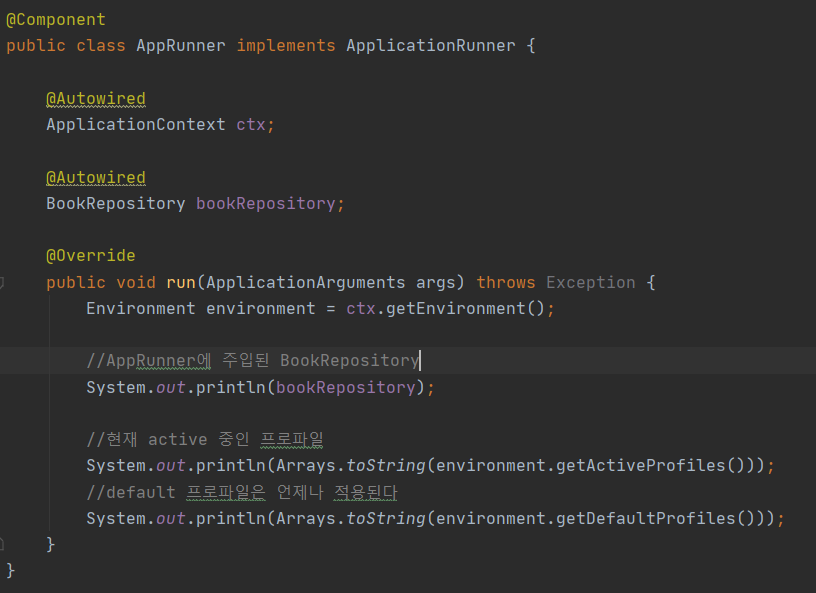 - 다음과 같이 잘 실행된다! 그리고 active한 profile은 없지만 현재 test가 아니기 때문에 Bean이 잘 주입된다!